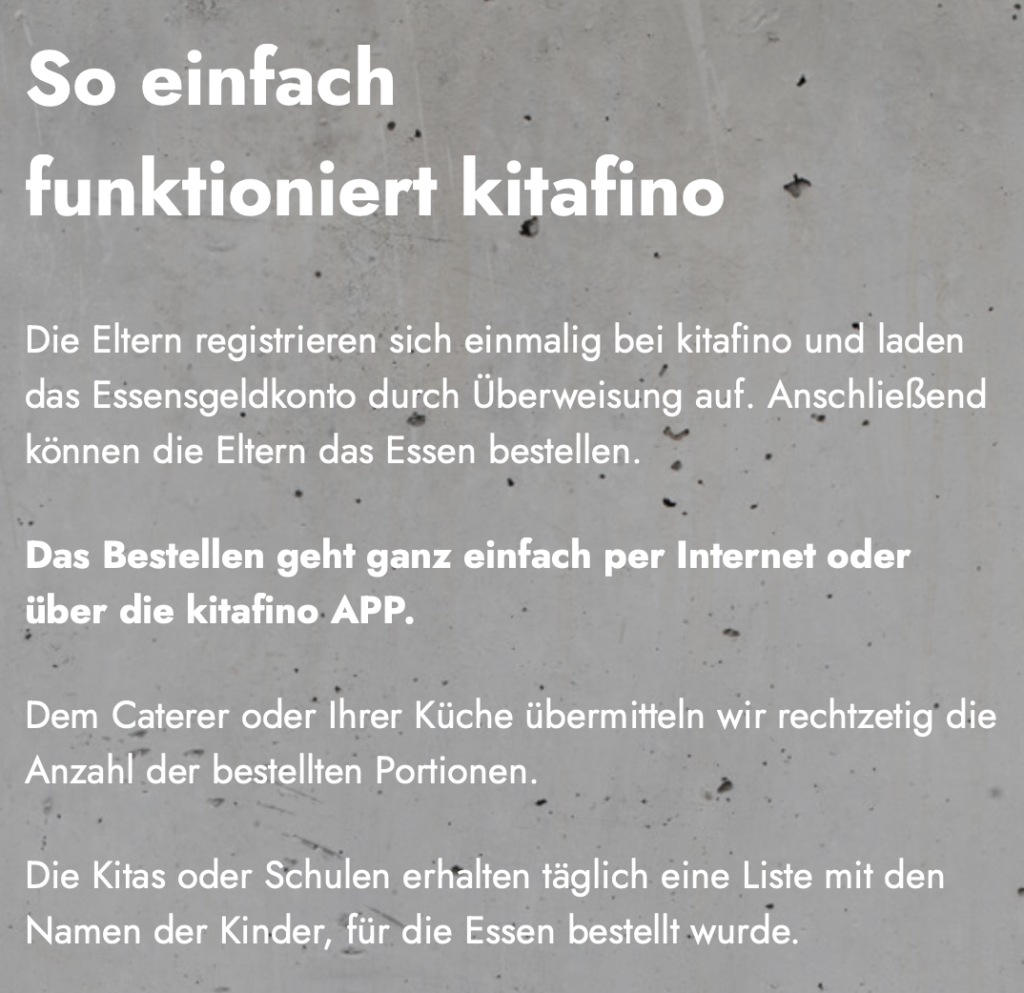Die Bestellung des Essens erfolgt im Voraus durch die Eltern digital bei „kitafino“ über das Internet oder die kitafino-App.